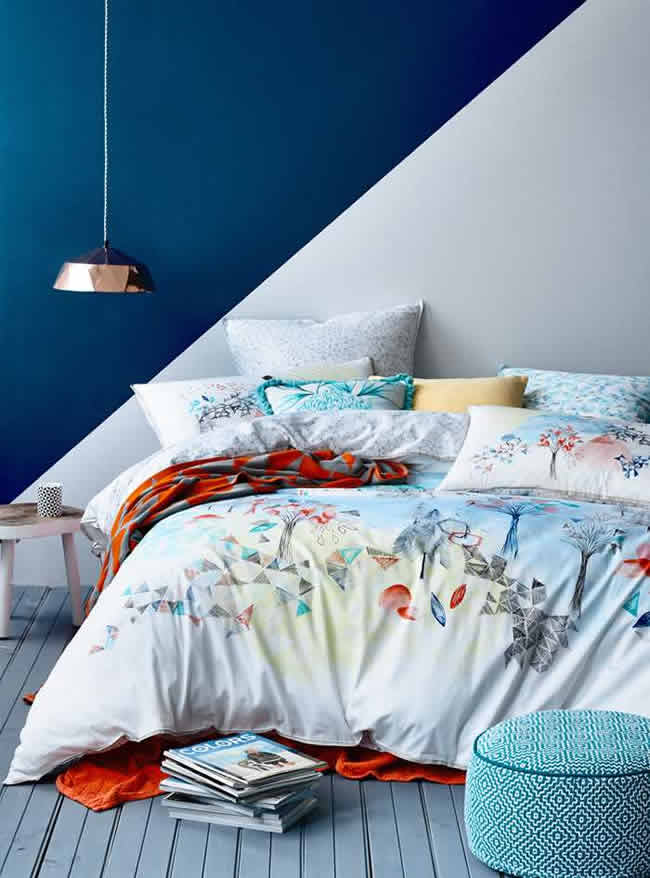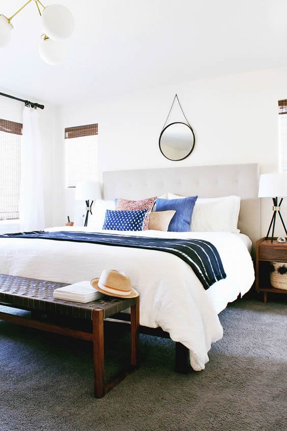 Беспроигрышное сочетание натурального белого и кобальтового цветов создаст ощущение морской свежести, визуально расширит пространство небольшой спальни и, в целом, будет выглядеть всегда актуально.