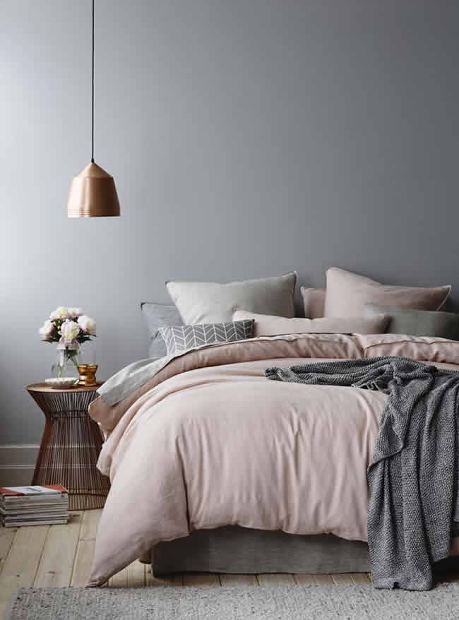 Сочетание, ставшее классическим, открывает наш список вариантов цветовых комбинаций для интерьера спальни. Оттенки можно применить при облицовке стен и для постельного белья, дополняя светло-серый и нежно розовый блестящими медными аксессуарами (освещение, декор)