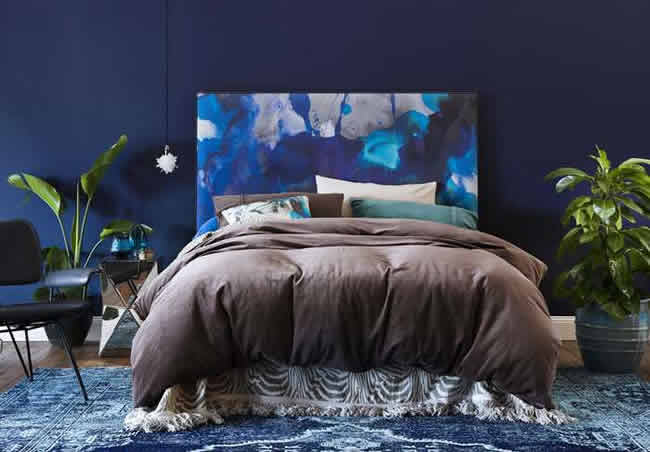 Так, холодный синий формирует умиротворенную атмосферу, а теплый терракотовый (охра, сицилийский апельсин) гармонично дополняют и оживляют интерьер спальни.